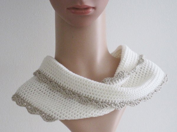Passend zur Mütze häkelst Du den Schal mit dem coolen Dreh: Der Möbiusschal gehäkelt in Winterweiß mit Glitzerborte. - Nun ist das Set perfekt!