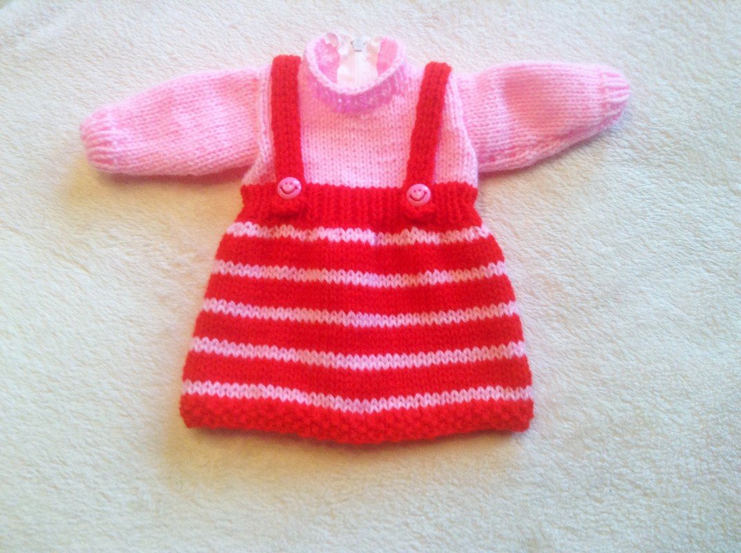 Strickanleitung für ein Puppenoutfit, bestehend aus Kleid, Zipfelmütze und Socken. Einfach zu stricken, es sind nur einfache Kenntnisse erforderlich.