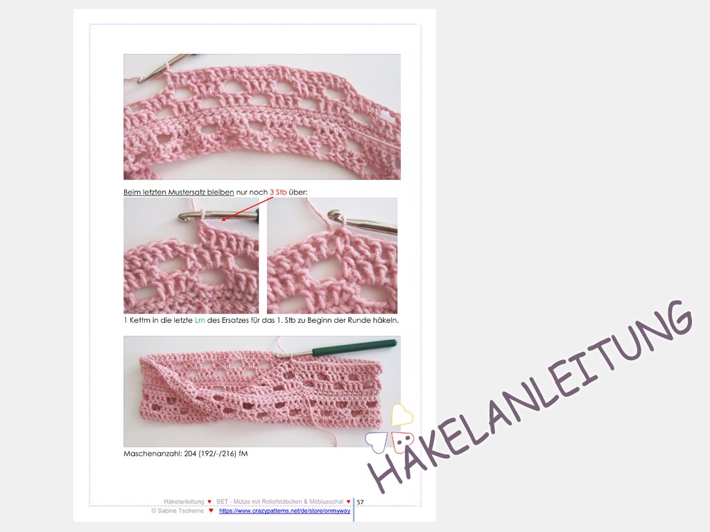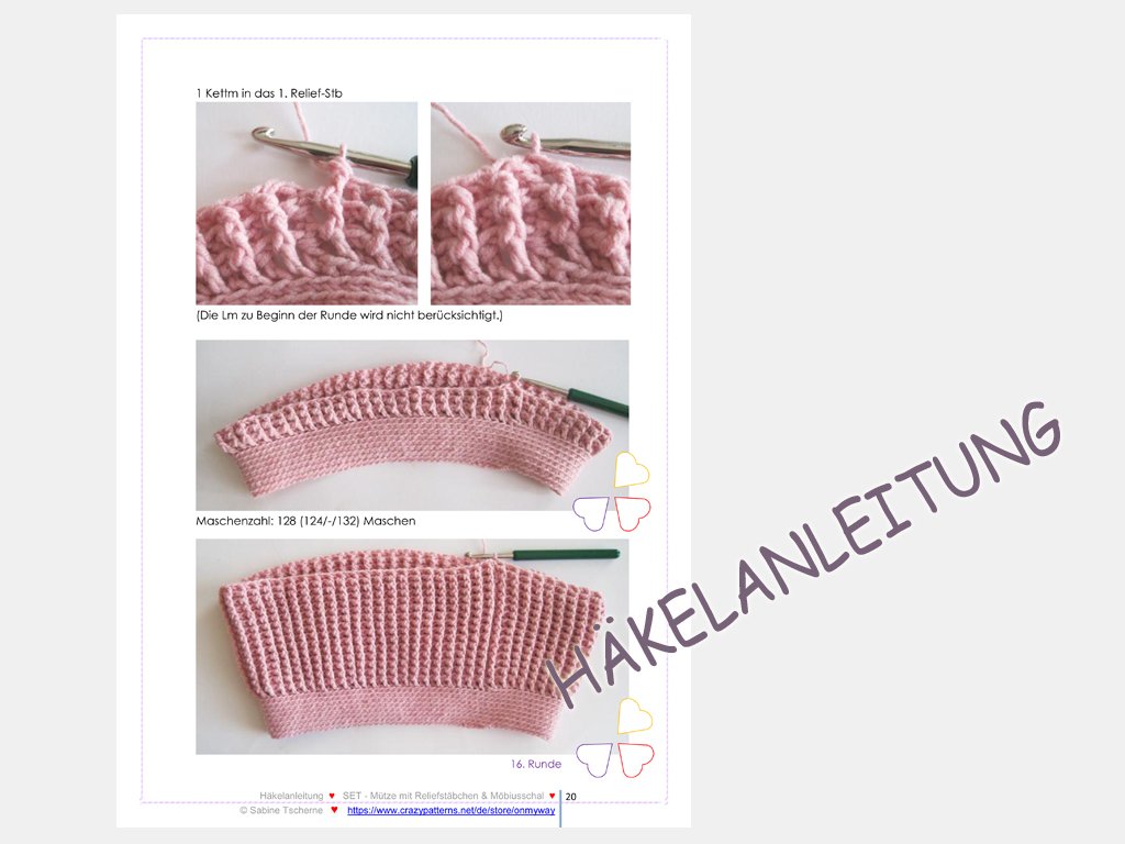 Die schicke Mütze für Mädchen und Damen wird ganz einfach mit festen Maschen und Reliefstäbchen gehäkelt. Passend zur Mütze nun der Häkelschal mit dem coolen Dreh: Ein Möbiusschal!