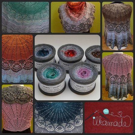 Das von verwendete Farbverlaufsgarn-Serie kommt aus dem Hause Nomis-Valent und hat den gleichnamigen Namen Haldari, da das Garn für dieses Tuch gewickelt wurde. Es kann aber natürlich mit jedem Garn deiner Wahl gehäkelt werden.