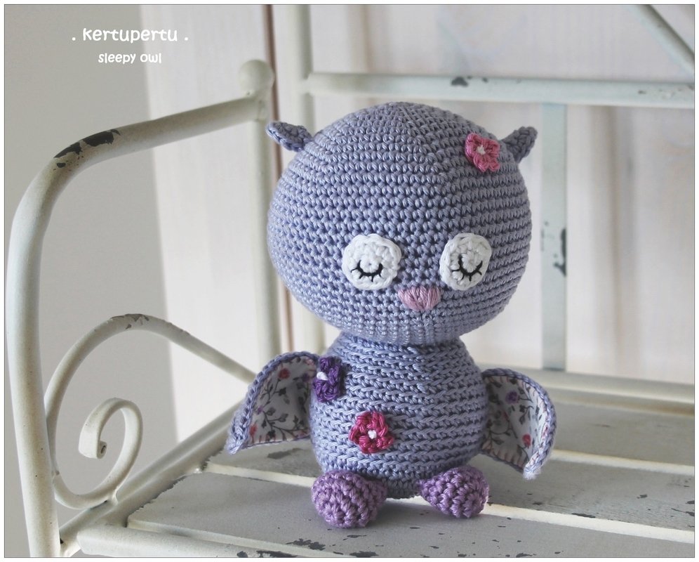Handgemachte schlafende Eule von Kertupertu. Blümchen, Streifen so wie Stoff aus Baumwolle - diese Details machen das Vögelchen unwiderstehlich niedlich.