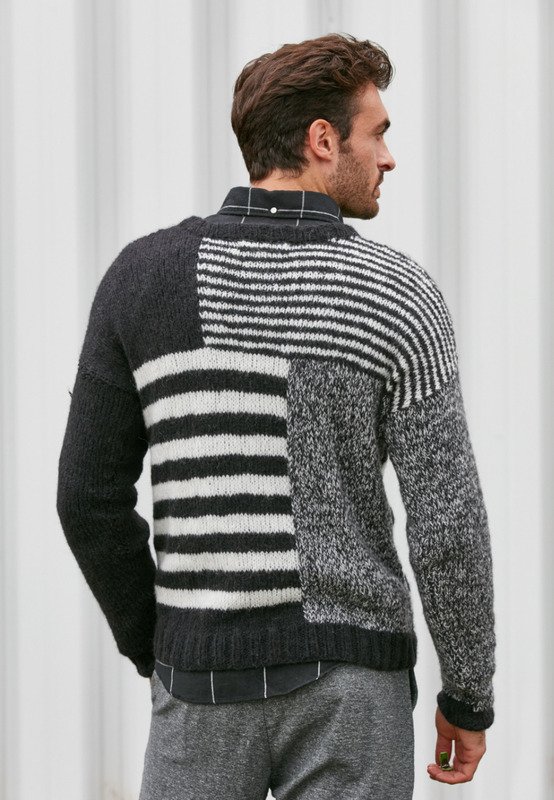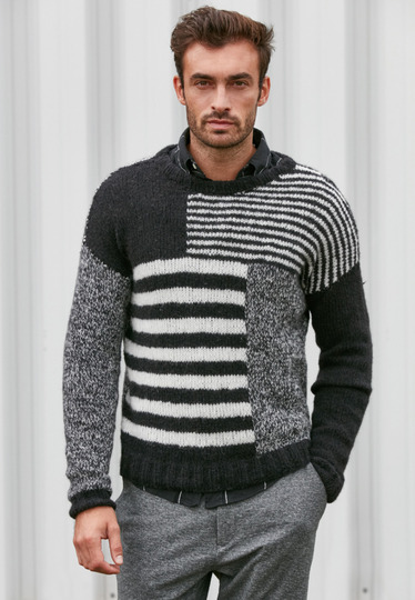 Strickpullover sind zeitlose Begleiter für die kälteren Tage des Jahres. Dieser lässt klassische Streifen in einem kreativen Mustermix wieder aufleben und sieht auch im Büro gut aus.