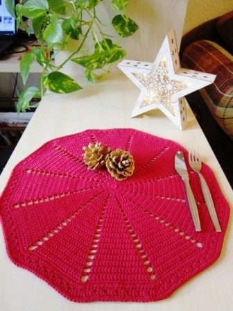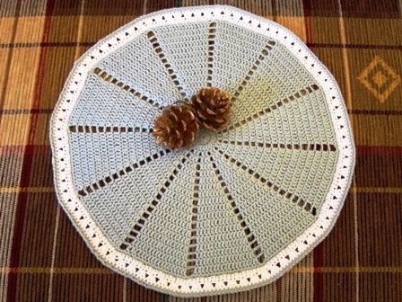 Bei mir ist das Platzdeckchen ca. 36 cm im Durchmesser.Ich habe es mit einer Häkelnadel 2,5 gearbeitet und ein Baumwollgarn LL 160/50g verwendet. Wer fest häkelt, nimmt bitte eine Nadelstärke größer.