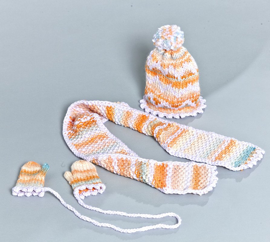Schal: 14 x 121 cm lang, Mütze: Umfang 44-46 cm, Fäustlinge: ca 3 Jahre