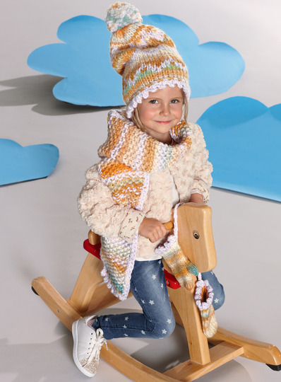Mit dieser schlumpfigen Bommelmütze, dem dicken Schal und den Fäustlingen, die mit einer Luftmaschenkette verbunden sind, kann dir selbst eisige Kälte nichts anhaben. Stimmt's?