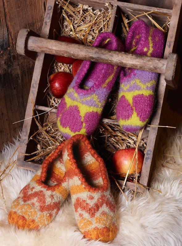 Lieber herzig oder ganz schön auf Zack? Mit diesen Puschen zum Stricken ist beides möglich, denn das eine Paar hat ein Jacquardmuster mit Herzen, das andere mit Zacken. Die Hausschuhe werden aus Filzwolle gestrickt und dann zum Verfilzen in der Waschmaschine gewaschen. Die Strickanleitung ist für zwei Paare mit verschiedenen Farben und Jacquardmustern, jeweils in Größe 39.