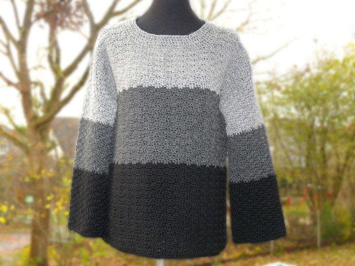 Da ich eine absolute Frostbeule bin habe ich mir einen schönen warmen und flauschigen Pullover gehäkelt :) Der tolle Pulli wärmt euch in der kalten Jahreszeit. Da er mit doppeltem Faden gehäkelt wird, ist er im handumdrehen fertig. Ob mit oder ohne Rollkragen, der Pullover sieht durch das Muster und die Blockstreifen sehr schön aus.