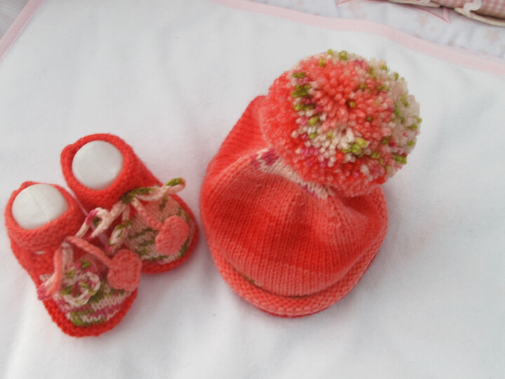 Das Set ist aus Babywolle und Farbverlaufswolle gestrickt. In der Anleitung steht wo du die Wolle kaufen kannst