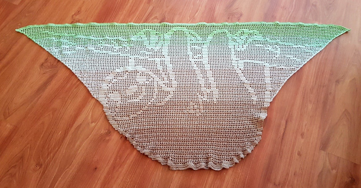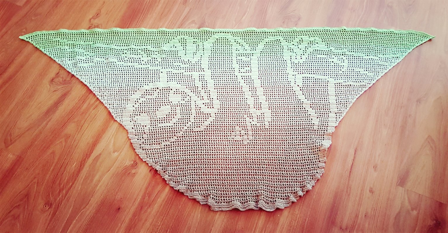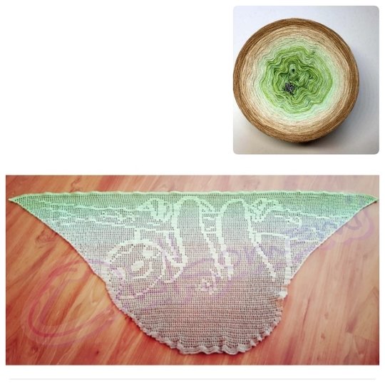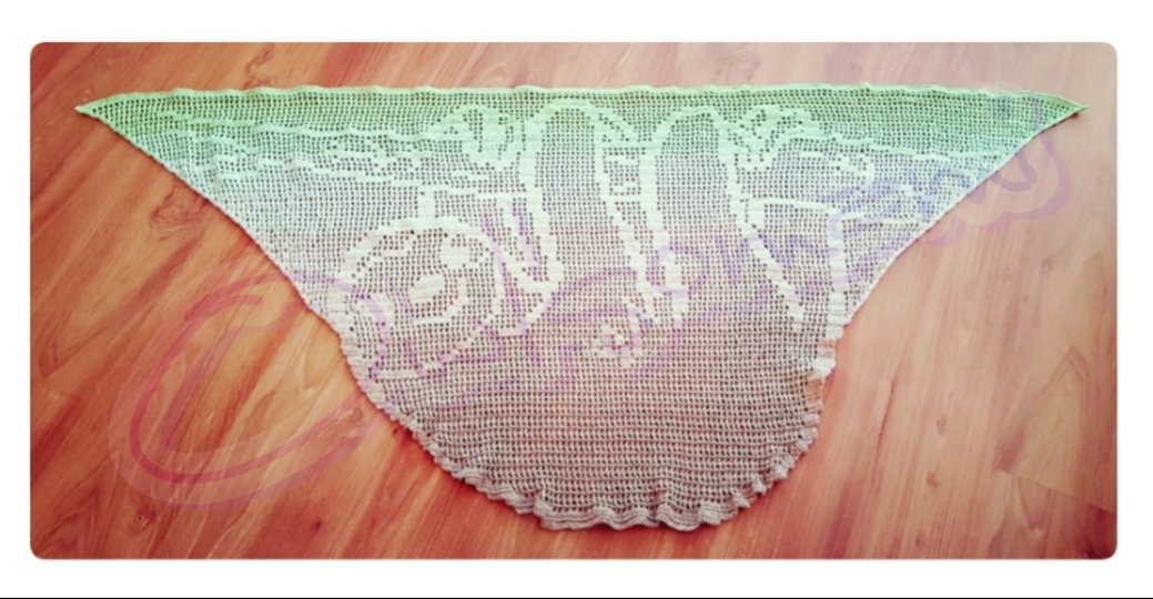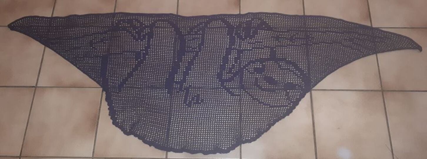 Das Tuch wurde mit ca. 1050 Metern 3- fach gefachtes Farbverlaufsgarn mit einer Nadelstärke 2,5 gehäkelt. Das Tuch ist ca. 180 cm lang und ca. 75 cm breit. Diese Motivtuch hebt sich von anderen Tüchernüchern durch seine halbrunde Form sehr ab und ist somit ein echter Hingucker!
