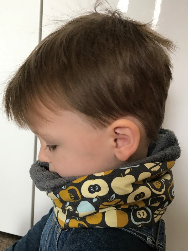 Im Set sind auch Schnittmuster und Nähanleitung für einen passenden Loopschal enthalten. Das Schnittmuster zum Loop enthält vier Größen, geeignet für Kinder von 0 Monaten bis 8 Jahren