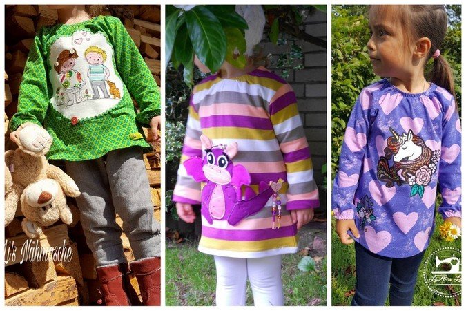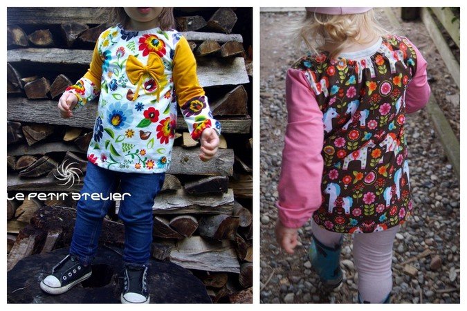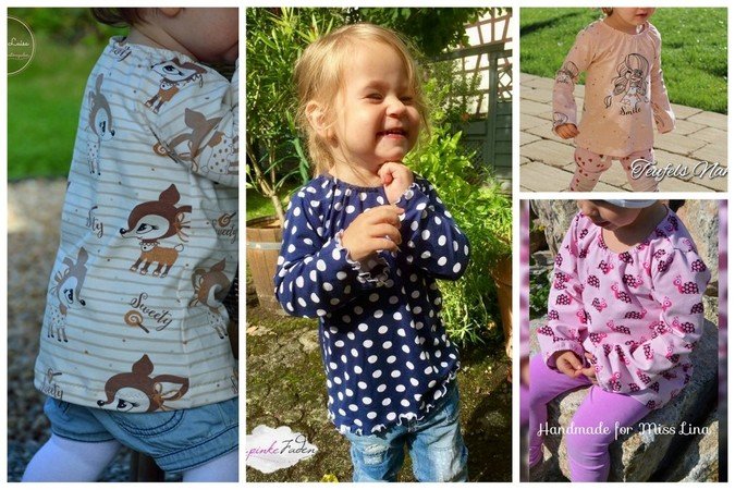 Ein Basicschnitt und doch etwas ganz Besonderes: Sophia wird am Hals und an den Ärmeln mit einem Gummizug abgeschlossen. Dadurch wird er leicht gerafft und so entsteht ein richtiger Hingucker – eben so ein richtiger „kleines Mädchen“-Look. Nähbar von Gr. 74 – 104 in Einzelgrößen und garantiert auch für Nähanfänger geeignet. Bei den Ärmeln könnt ihr aus 2 Variationen wählen: schmale Ärmel und Ärmel, die zum Handrücken hin breiter werden – so entsteht ein puffiger Effekt.