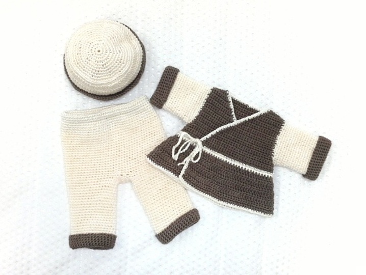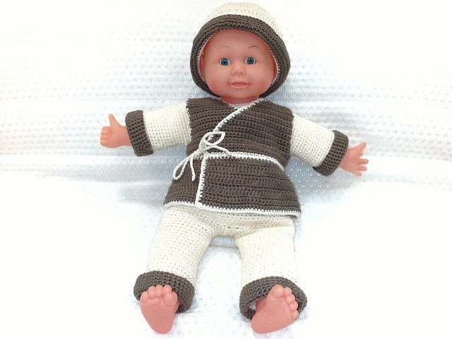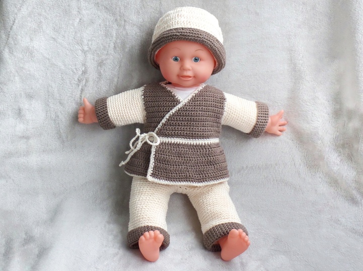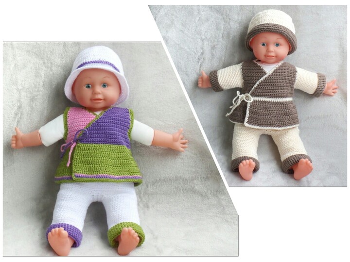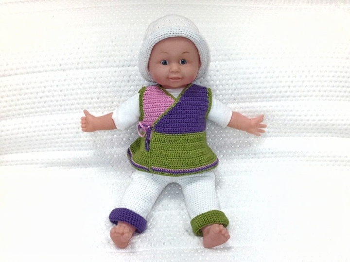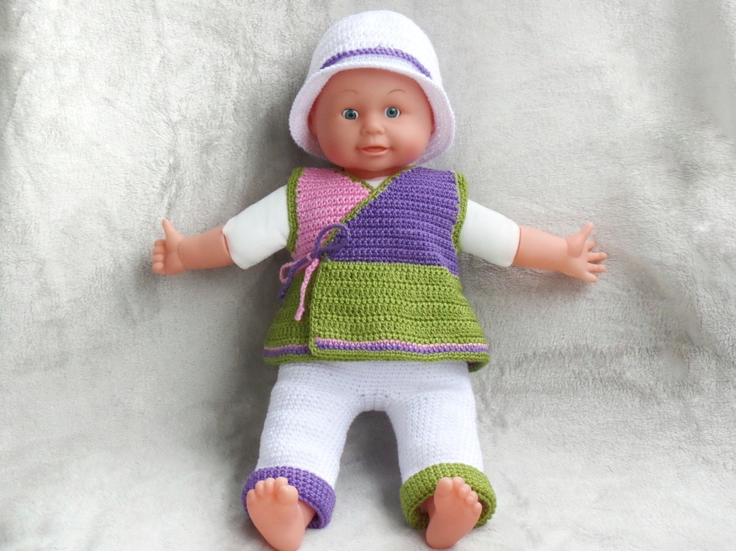 Ein ganzes Set aus Hose, Wickeltop und Hut für eine 40 cm große Puppe.
