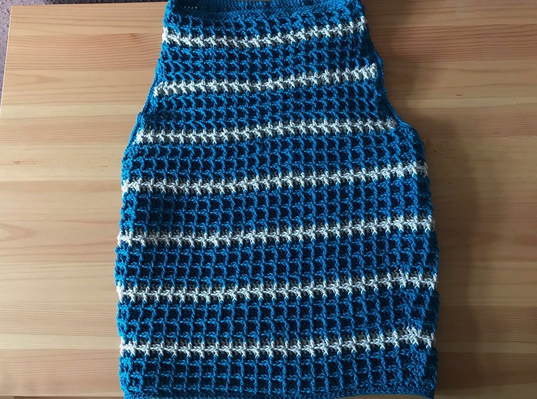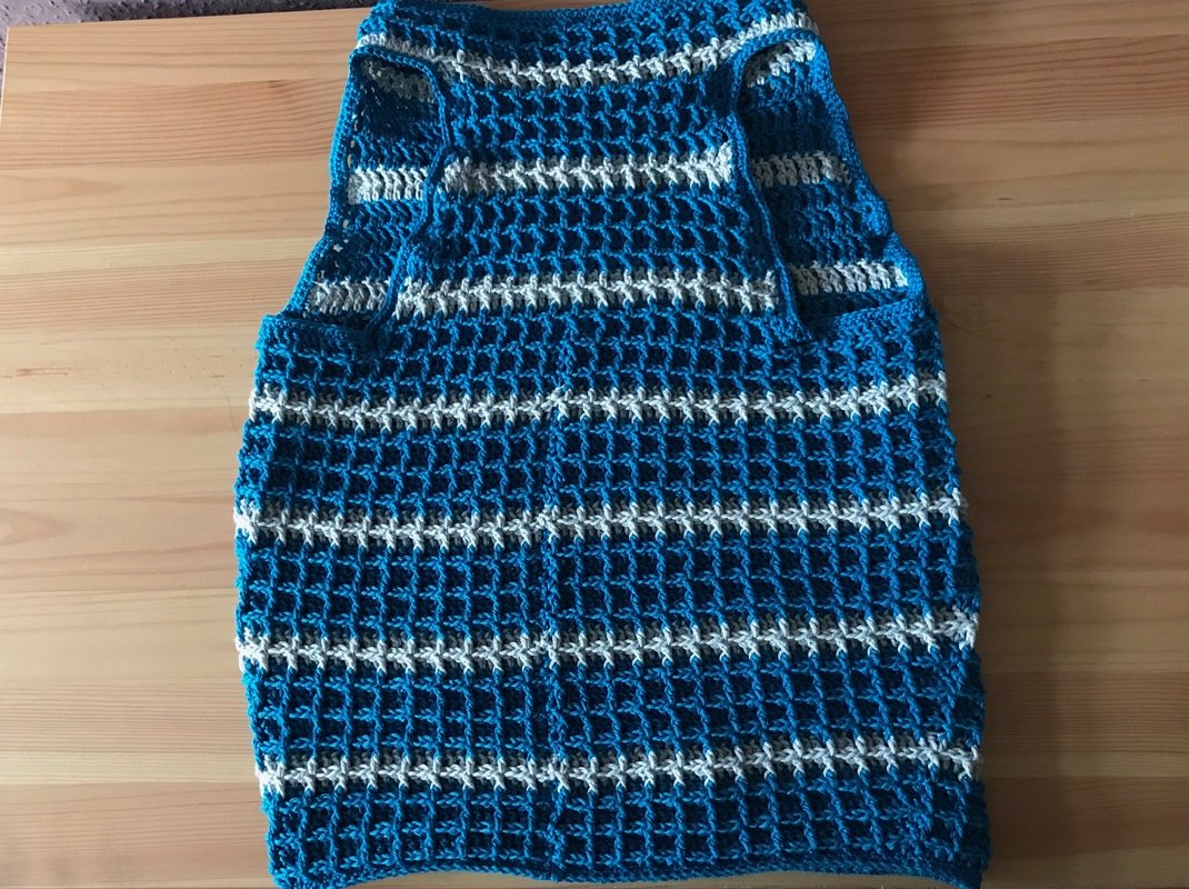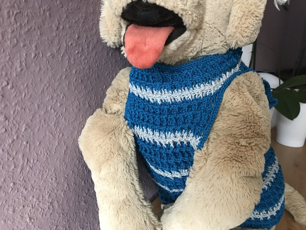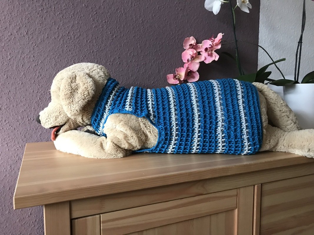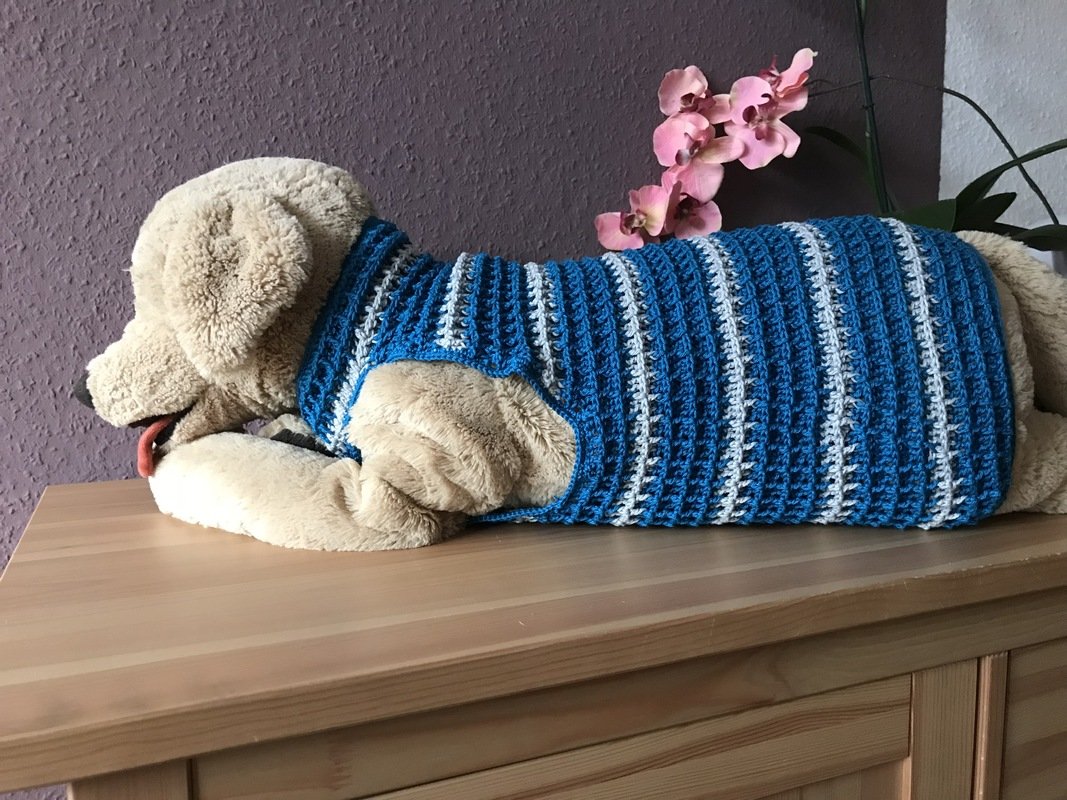 Dieser Hundepullover ist passend für Labrador und Co. Durch die relativ großen Armausschnitte lässt sich der Pullover an kalten Tagen leicht anziehen. Das Strukturmuster sorgt für viele Schichten Wolle und somit ausreichend Wärme für den Vierbeiner.