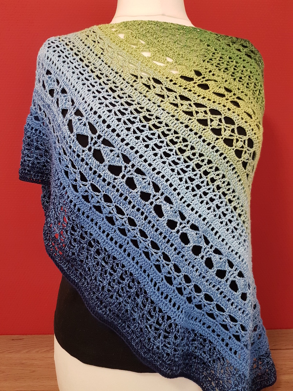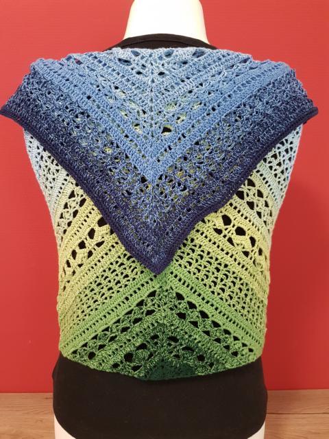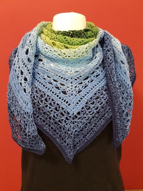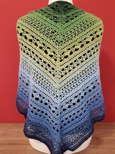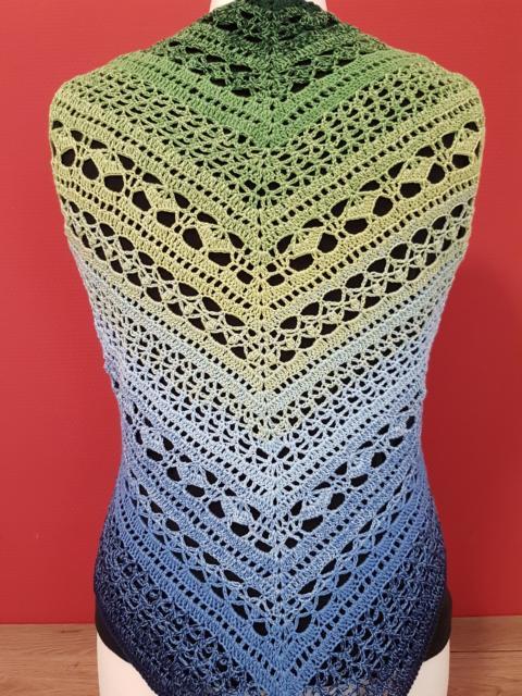 Das Tuch Akelei ist ein Dreieckstuch das besonders gut mit Farbverlaufsgarn zur Geltung kommt.