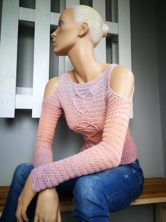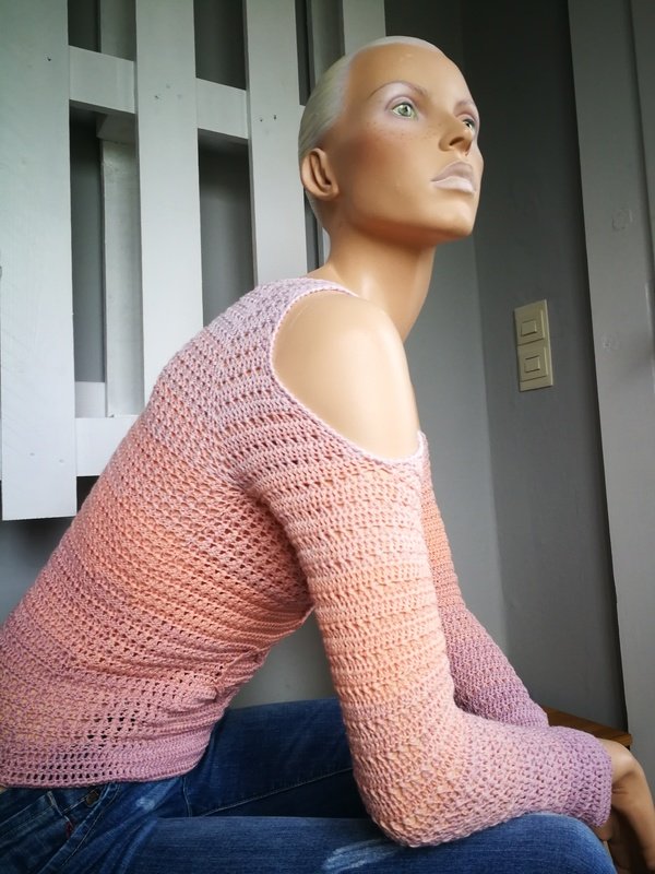Der Pulli hat hübsche Schulterlöcher und ein hübsches schlichtes Muster.