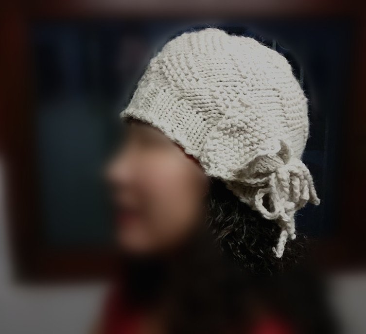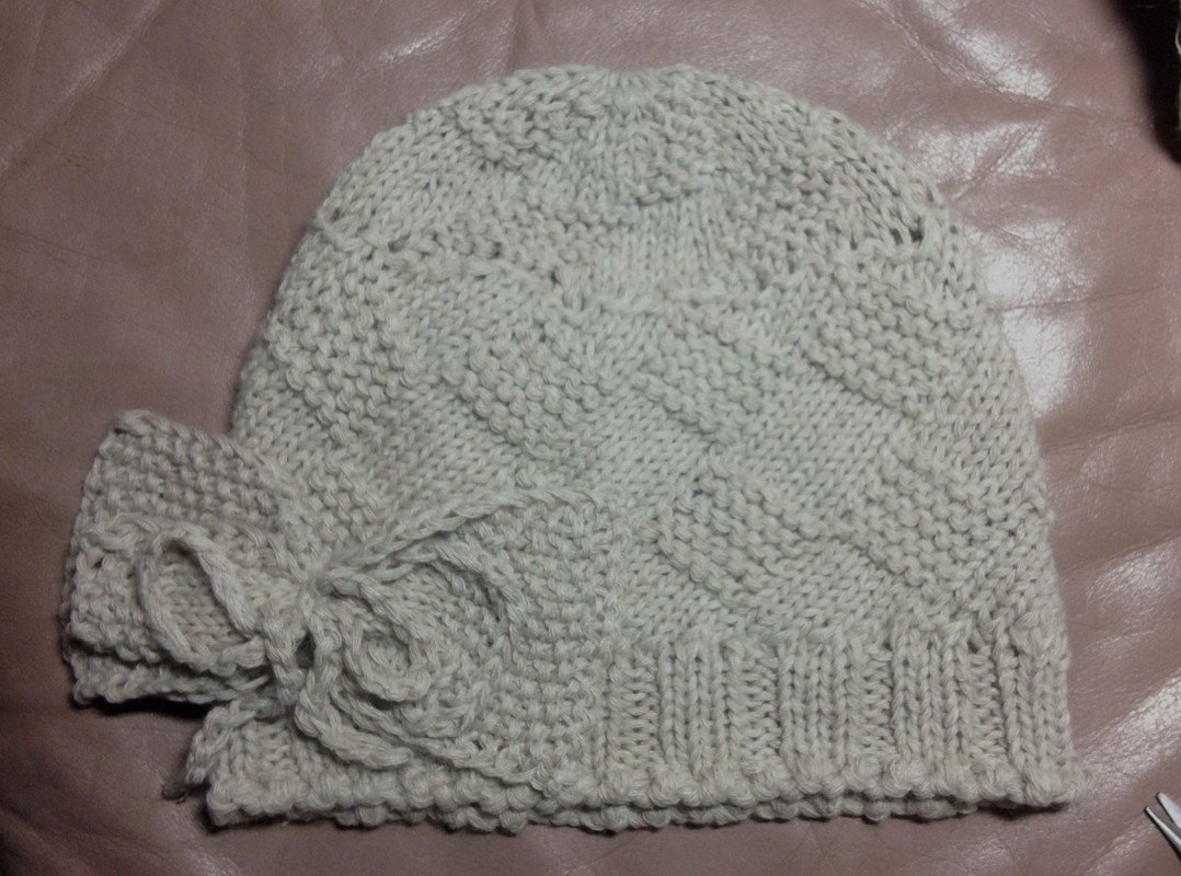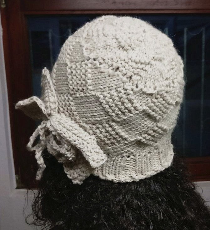 Hier habe ich eine fertig gestrickte elegante Mütze mit Schleife & Karo-Muster!