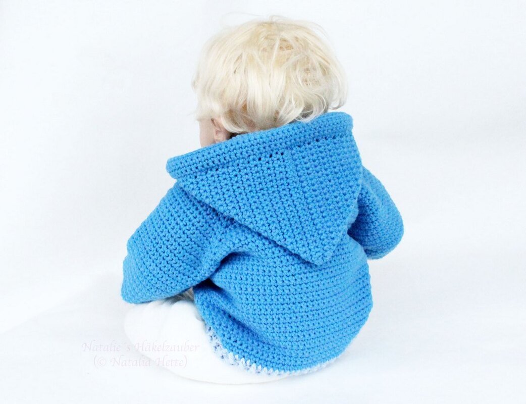 Wichtig! Machen Sie bitte keine Schnüre im Halsbereich bei den Babys und Kleinkindern, sondern häkeln Sie die Kapuze mit einigen Reihen fM um.