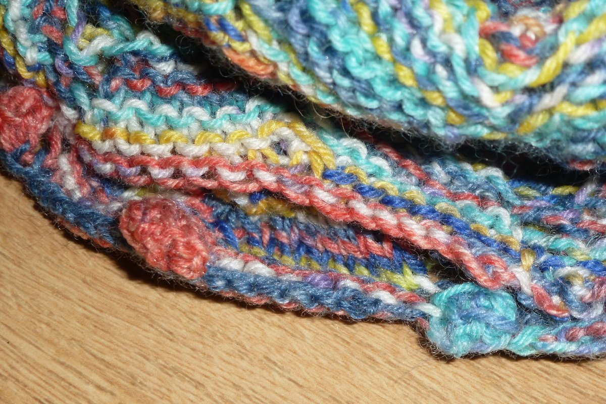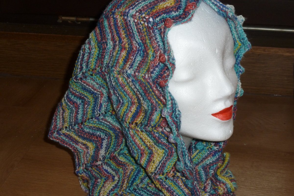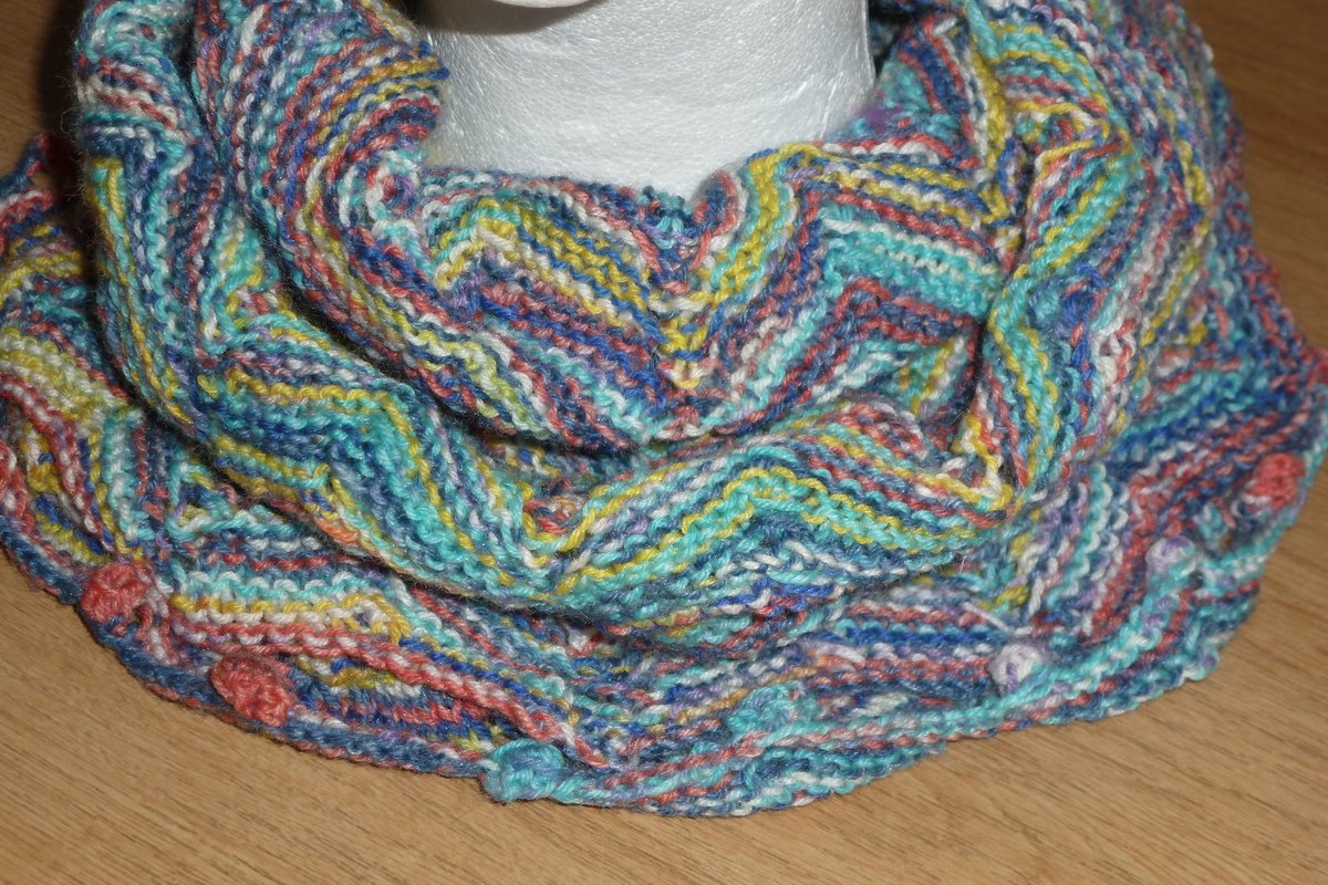 Ein schöner Loop aus bunter Wolle gestrickt, das Zickzackmuster