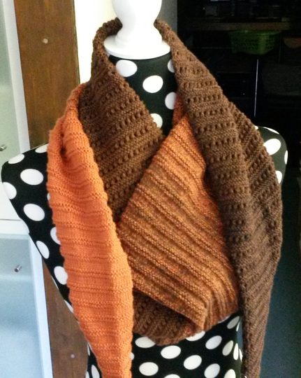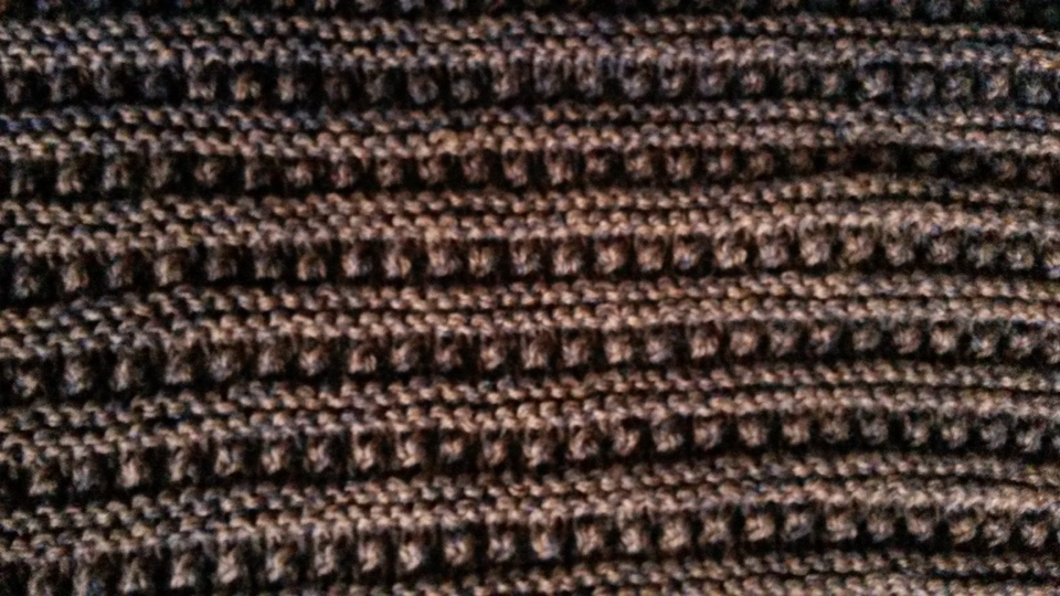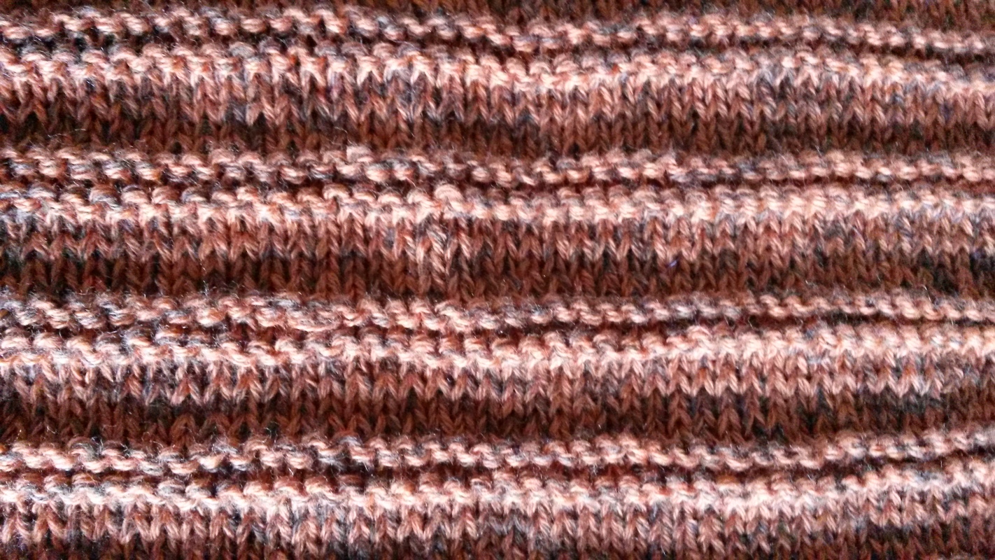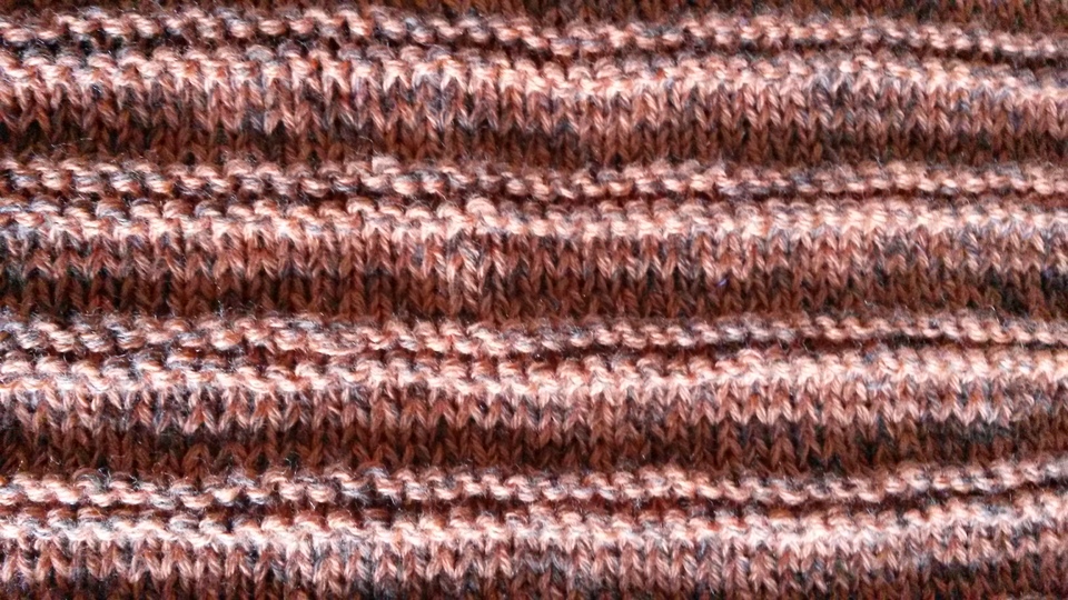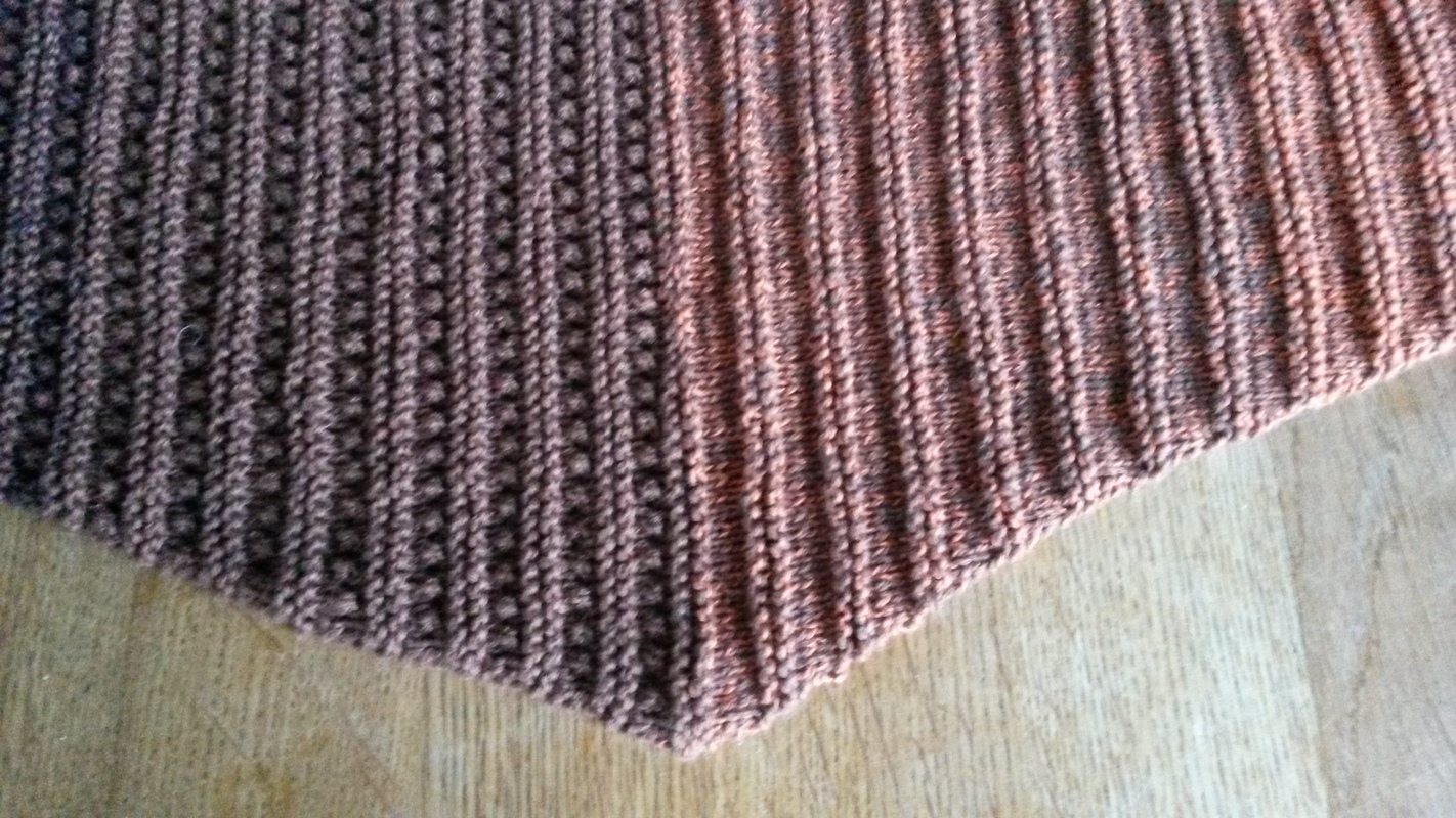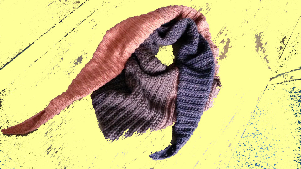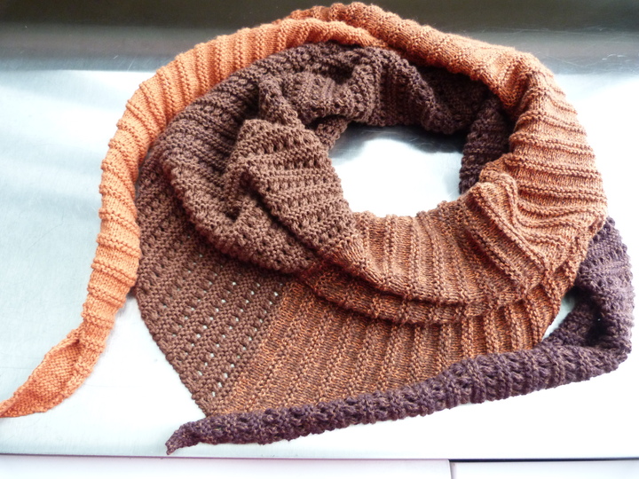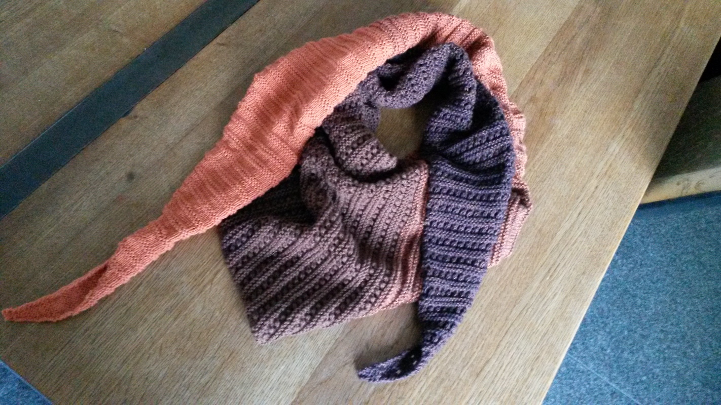 Das dreieckige Schultertuch misst 200 x 42 cm. Ich habe es aus Bobbel-Garn von Rellana gestrickt. Es wird aus zwei Mustern zusammengemixt: Kraus-rechts-Rippenmuster und Ajour-Rippenmuster.