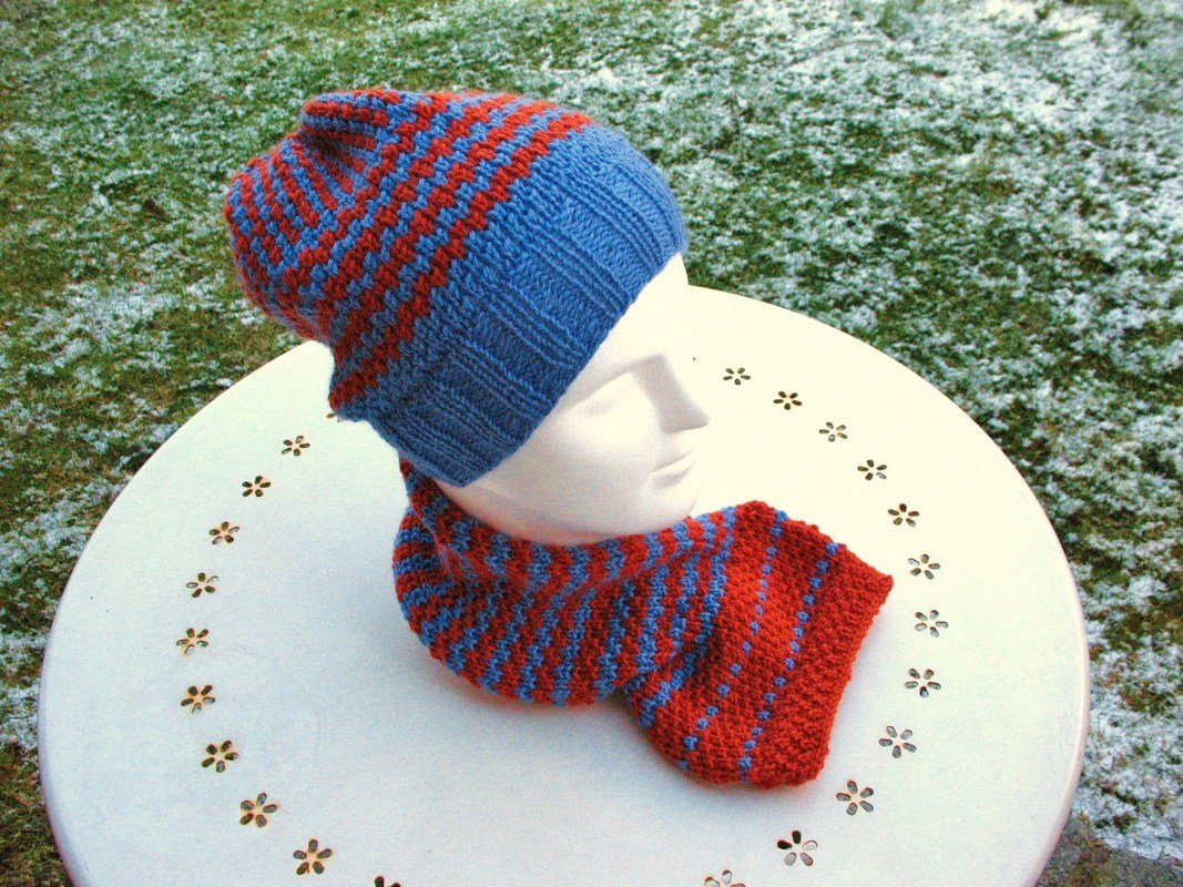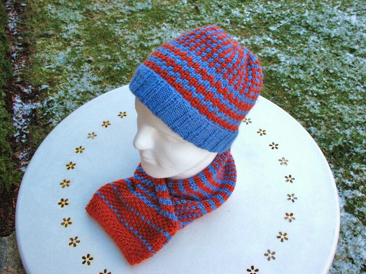 Hier bekommst du eine Strickanleitung für eine Mütze mit passendem Schalkragen für Herren.