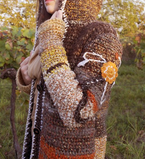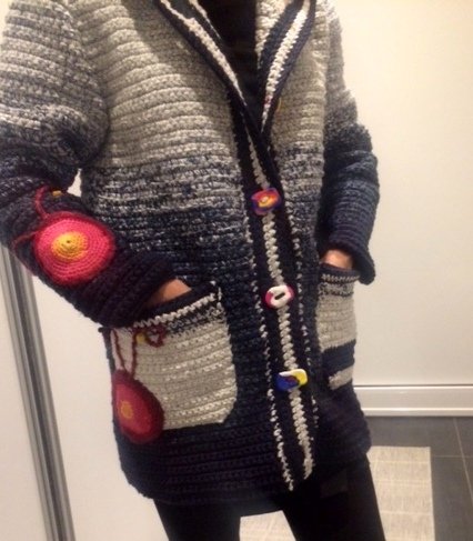 Ich habe bei meinen Jacken 1 - 2 Grundfarben mit Beilaufgarne ( Konengarne ) genommen und dazu verschiedene Wollreste verarbeitet. Man muss nur darauf achten, dass die Stärke beim Mischen der Garne gleich ist.