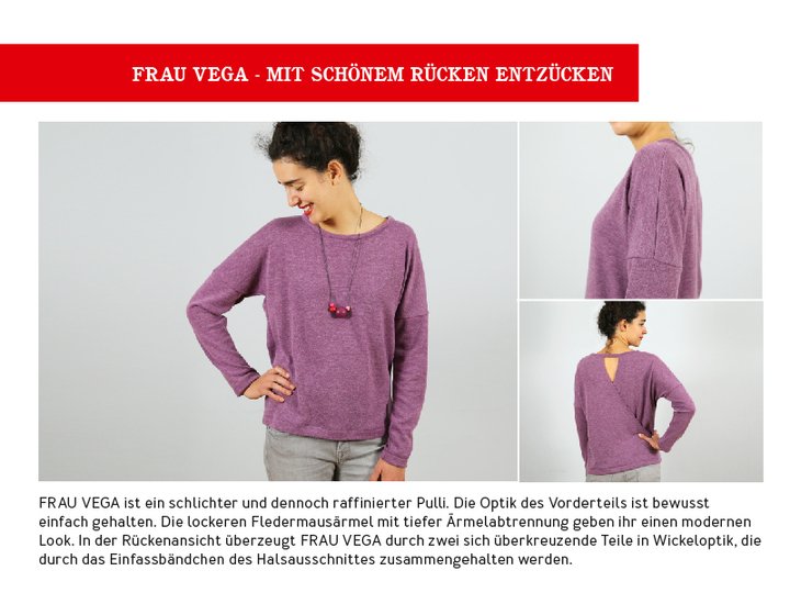FRAU VEGA ist ein schlichter und dennoch raffinierter Sweater. Die Optik des Vorderteils ist bewusst einfach gehalten. Die lockeren Fledermausärmel mit tiefer Ärmelabtrennung geben ihr einen modernen Look. In der Rückenansicht überzeugt FRAU VEGA durch zwei sich überkreuzende Teile in Wickeloptik, die durch das Einfassbändchen des Halsausschnittes zusammengehalten werden.