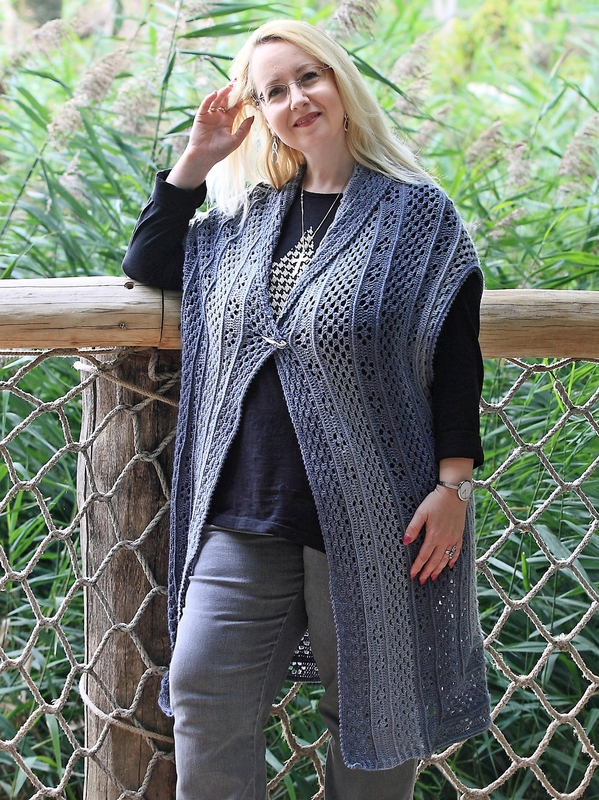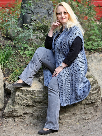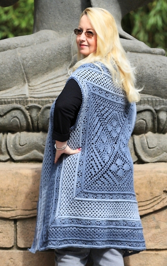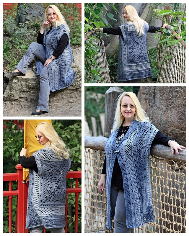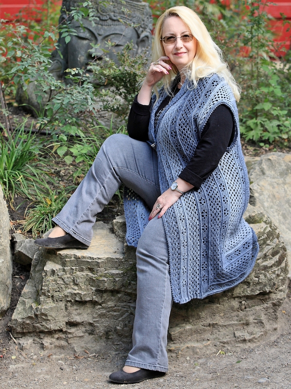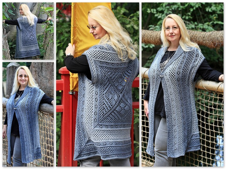 Die Häkelweste wird in einem Stück gearbeitet, beginnend am Rücken. Sie kann mit vielen Garnen nachgehäkelt werden und schmeichelt jeder Figur von S bis XXL. Man benötigt keine festen Maße um die Weste nachzuarbeiten.