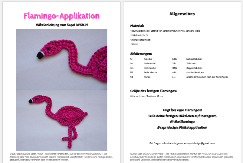 Die Häkelanleitung ist eine 11 Seiten lange PDF-Datei mit vielen Bildern und ausführlichen Beschreibungen. Schritt für Schritt wird erklärt wie du den Flamingo häkelst.