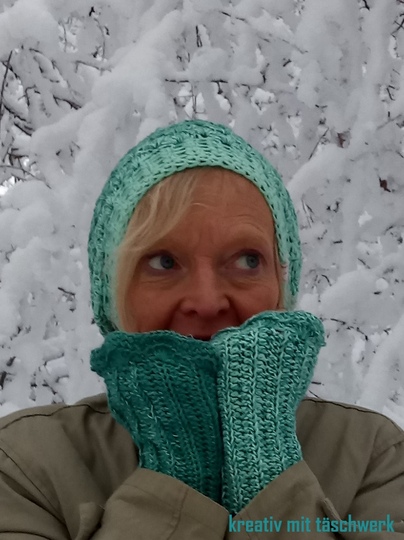 Mein Garnverbrauch lag bei 50g, 6-fädiges Farbverlaufsgarn Baumwolle/Acryl mit einer Lauflänge von 250 Meter auf 100g. Gehäkelt habe ich mit Nadelstärke 4,5.