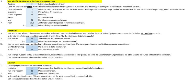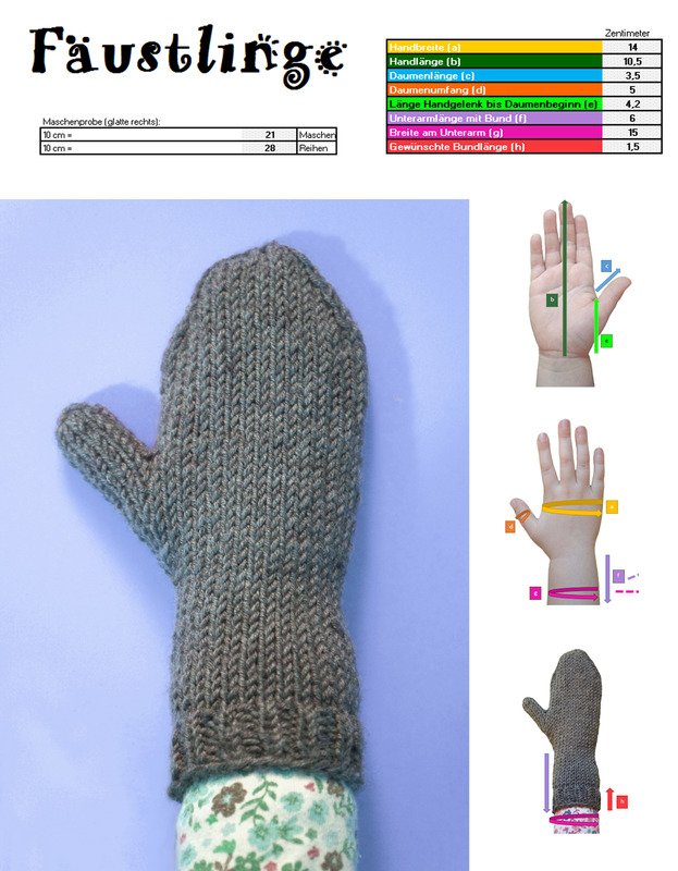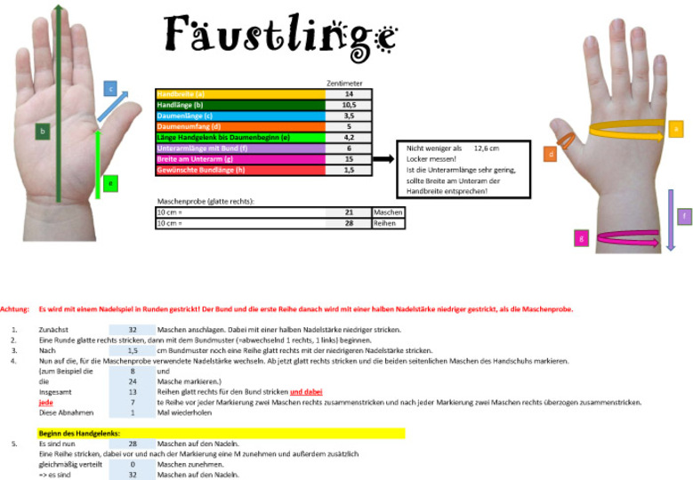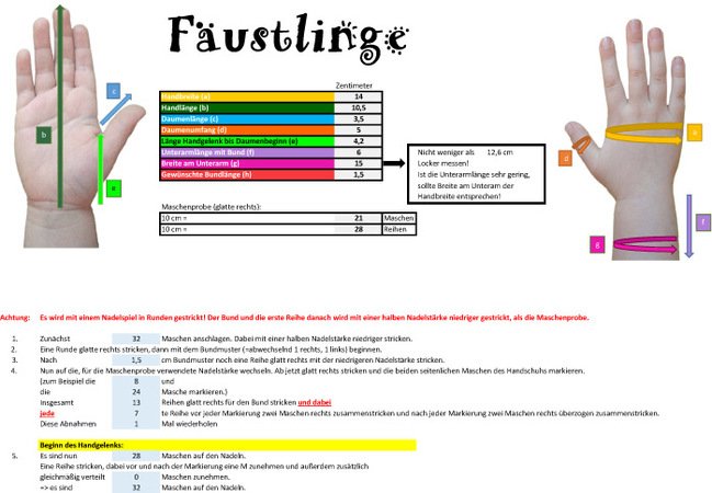 Beim Kauf steht eine Excel-Datei zur Verfügung, auf Grund derer die Strickanleitung für Fäustlinge berechnet wird. Dazu einfach die Maschenprobe und Werte der ausgemessenen Hand eingeben.