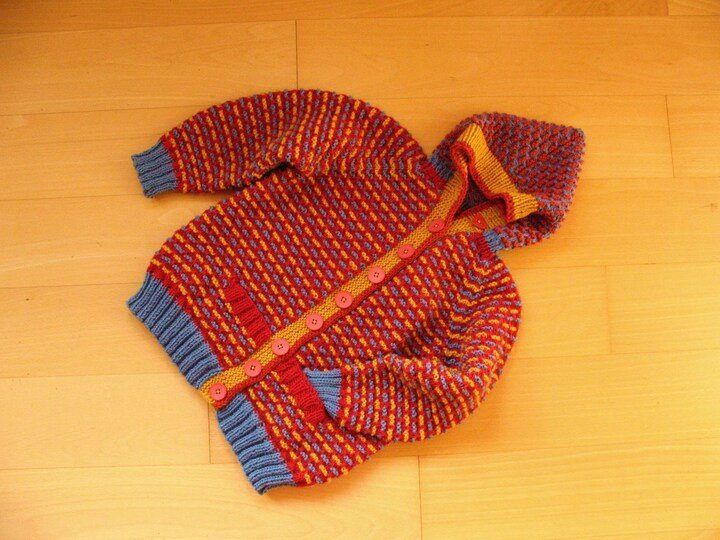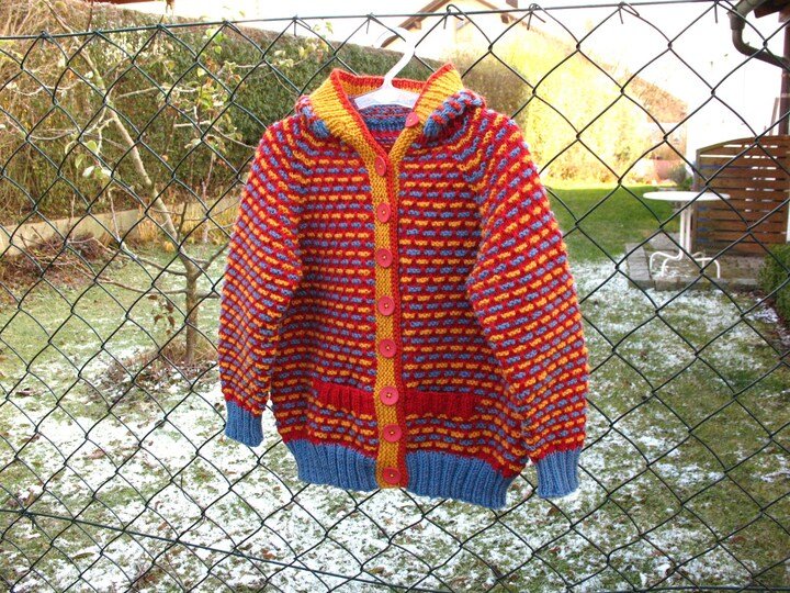 Diese Strickanleitung beschreibt eine Kinder-Strickjacke mit Kapuze und Taschen. Die angegebenen Maße sind passend für die Größe 92 - 104. Die Jacke kann von geübten Stricker/innen auch auf andere Größen angepasst werden.