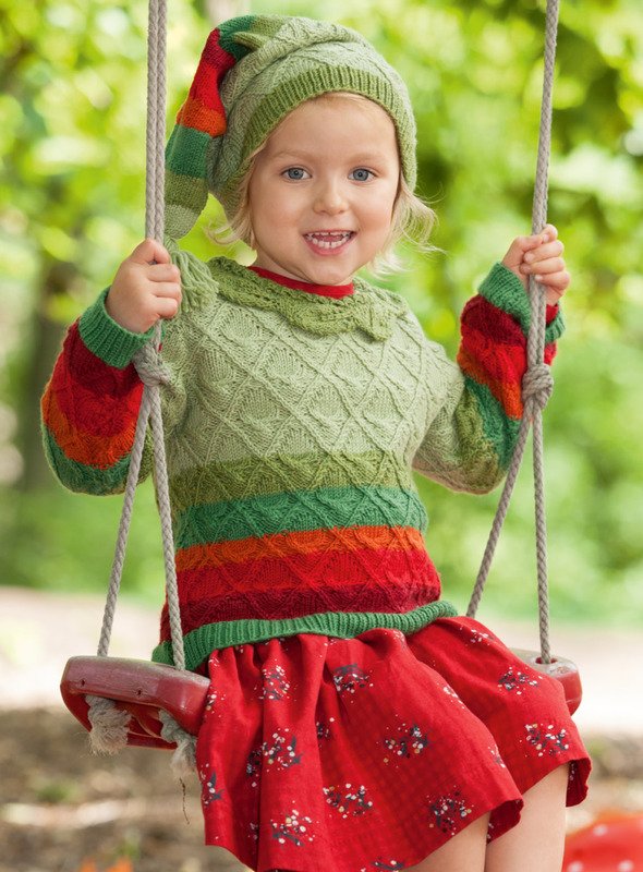 Wer hat dir denn diesen Pulli und die Zipfelmütze mit den bunten Steifen gezaubert? Mit einem schönen Blattmuster in der Raute und Blättern als Blende am Hals. War das die gute Fee?
