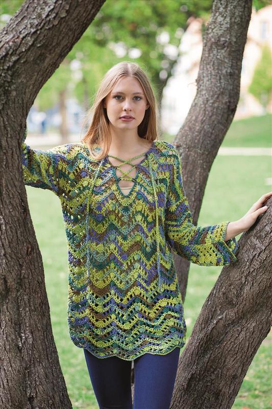Trendig unterwegs in neuem Look! Der gerade Schnitt, das grün-melierte Baumwollmischgarn und ein interessantes Wellenmuster verleihen diesem romantischen Hängerchen Frische und Leichtigkeit