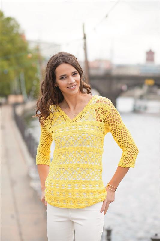Dieser sonnengelbe Häkelpulli läutet den Frühling ein. Das luftige Lochmuster im Wechsel mit dem Blütenmuster sorgen bei diesem trendigen Modell garantiert für Aufsehen!