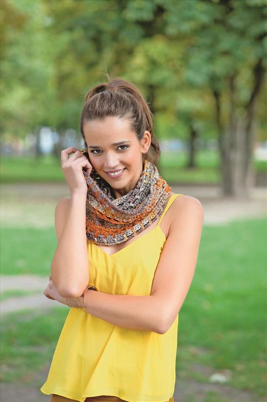 Für den Poncho 350 g und für den Loop 150 g Braun/Kupfer meliert (Farbe 185) „Vania“ (40% Baumwolle, 33% Viskose, 27% Leinen, Lauflänge = 90 m/50 g) von PRO LANA. KNITPRO-Häkelnadel Nr. 5.