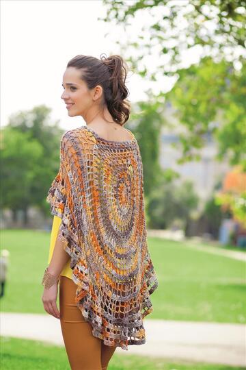 Dieser Häkelponcho hat Potential zum Lieblingsmodell! Er besticht durch ein wunderschönes Kreismotiv auf der Rückseite. Ein weiterer Blickfang: das kurze Vorderteil und die überlange abgerundete Rückseite. Dazu passend gibt´s den ebenfalls gehäkelten Loop