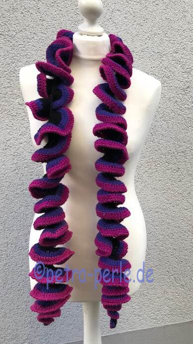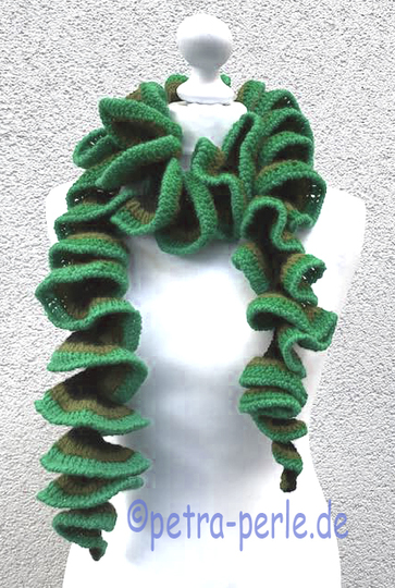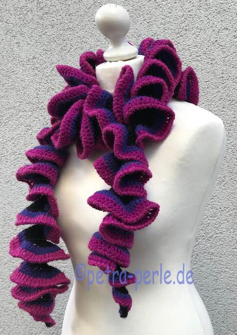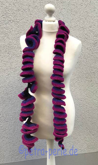 Dieser Schal, des aussieht wie eine riesige Luftschlange, ist ein herrliche Handarbeit...etwas monoton, deswegen auch sehr für lange Zugfahrten geeignet, oder wenn man nicht so viel mitzählen kann, weil man grade im Handabeitskränzchen sitzt....er geht recht flott von der Hand und ist fast mit jeder Wolle her zu stellen.