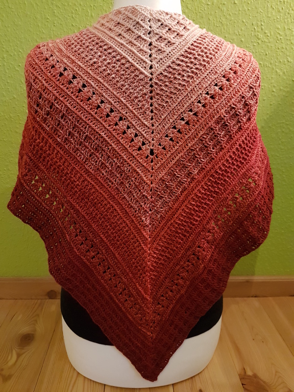 Für das Tuch in der Anleitung habe ich ca 245g / 1200m 3-fädiges Farbverlaufsgarn aus 50% Baumwolle und 50% Polyacryl mit einer Nadel der Größe 3,0 verwendet.
