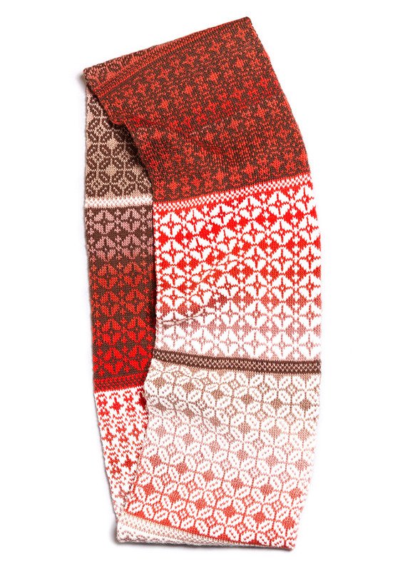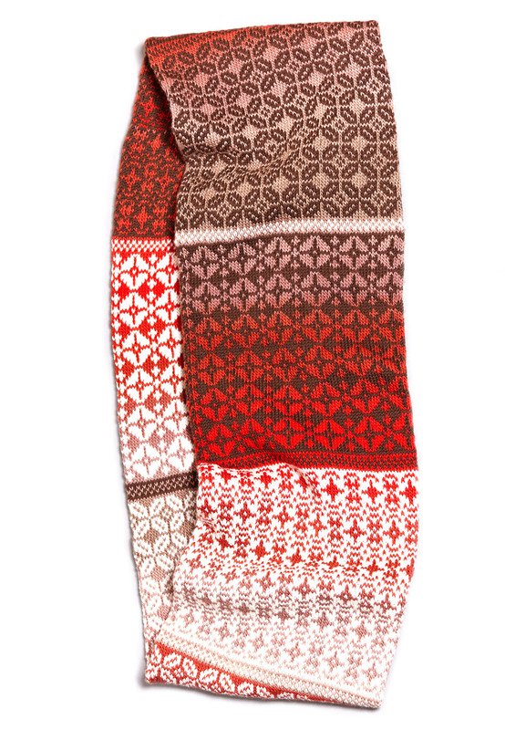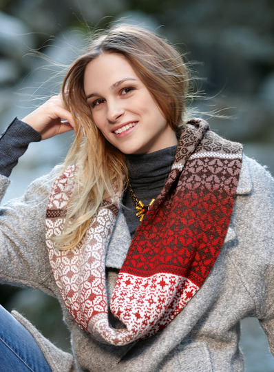 Strickanleitung für einen eleganten Loop-Schal mit verschiedenen aufeinander abgestimmten Jacquardmustern. Die exklusive Farbkombination macht diesen Loop zu einem besonders edlen Accessoire. Mal ist ein Farbverlauf in Beige-Rot-Tönen die Grundfarbe und Natur oder Braun die Musterfarbe, mal wird umgekehrt Natur oder Braun als Grundfarbe und der Verlauf als Musterfarbe eingesetzt. Der Loop hat einen Umfang von 137 cm und ist 22,5 cm breit. Zum Stricken wird eine Stricknadel in Stärke 3mm genommen. Der Loop ist also sehr fein gestrickt, wird am Ende doppelt genommen, so dass er schön warm hält.