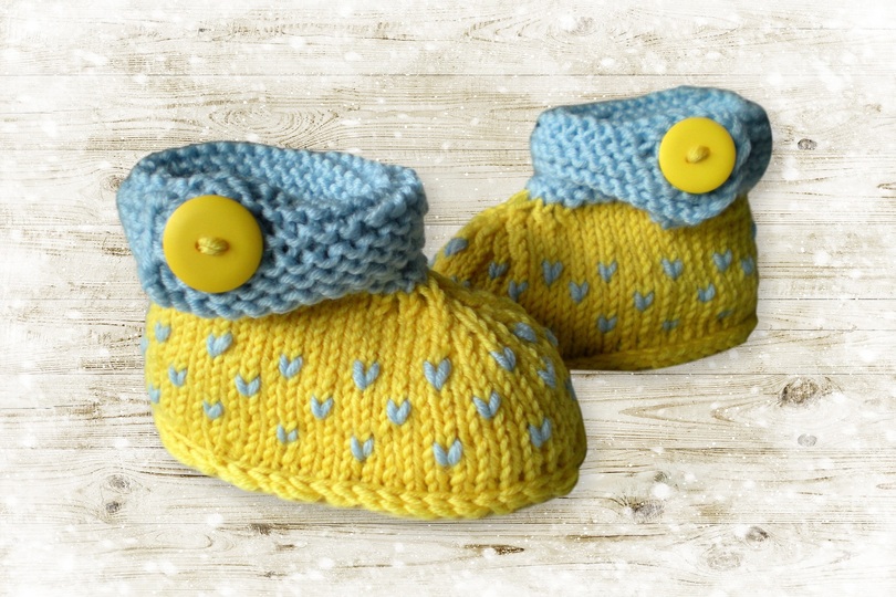 Mit dieser Anleitung strickst Du ruck-zuck supersüße Babyschühchen mit einer Sohlenlänge von ca. 10 cm. Du brauchst nur etwas Wollreste und 2 Knöpfe.