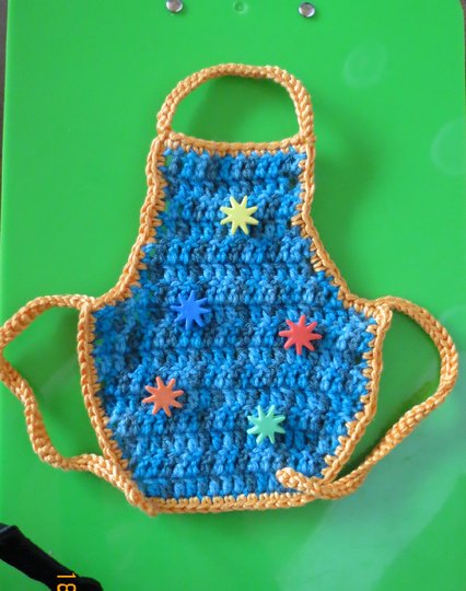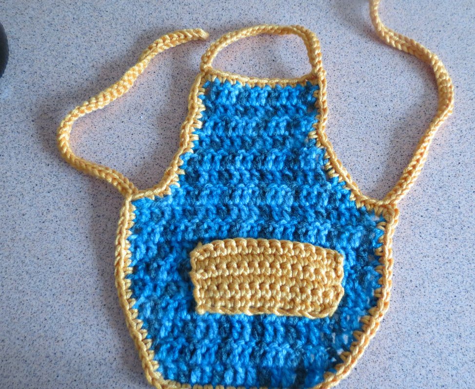 Die Schürze ist schnell gehäkelt, wiederverwendbar, und in das Täschchen kannst du eine persönliche Nachricht oder einen Geldschein stecken.