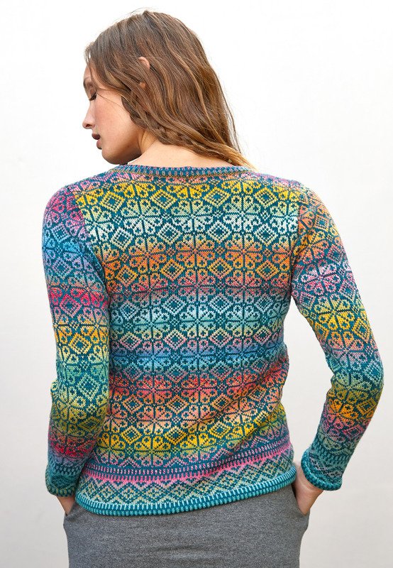 Wow - was für ein toller Pullover! Er vereint viele Farben und verschiedene Jacquardmuster und kommt trotzdem vollkommen harmonisch daher. Dieser Pulli mixt geometrische mit Blüten- und Rauten-Motiven und wird beim Stricken mit Nadeln 2,5 zu einer echten Fleissarbeit, die sich absolut lohnt! In der dunklen, blaugrün melierten Grundfarbe hebt sich die Musterung aus einem Farbverlaufsgarn, das in allen erdenklichen Blütenfarben schillert, besonders gut hervor. Mit dieser Strickanleitung, die für geübte Strickerinnen ist, können Sie den Pullover in den Größen 34/36, 38/40, 42/44 und 46/48 stricken.
