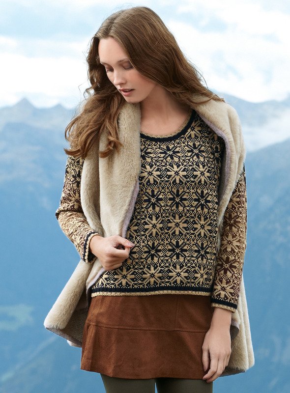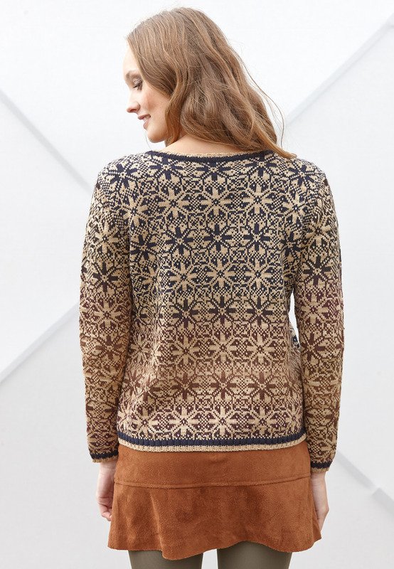 Ein Muss für Jacquard-Fans! Dieser Pullover hat ein ganz besonders Jaquardmuster: Hier wechseln nicht nur die Farben von Hell nach Dunkel, sondern auch die Musterquadrate, wodurch eine tolle Patchwork-Optik entsteht. Ganz einfach zu stricken ist der Pulli nicht, weshalb sich diese Strickanleitung an geübte Strickerinnen wendet. Die Anleitung ist in den Größen 36/38, 42/44, 48/50 und 52/54.