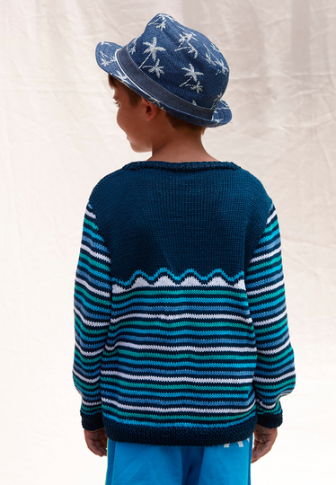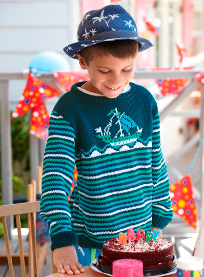 Geburtstag feiern? Okay. Aber ein Segeltörn, hart am Wind, wäre eher dein Ding,stimmt‘s! Das zeigt uns dein Pulli in cool gestreiften Blautönen mit dem Segelschiff bei Wellengang.