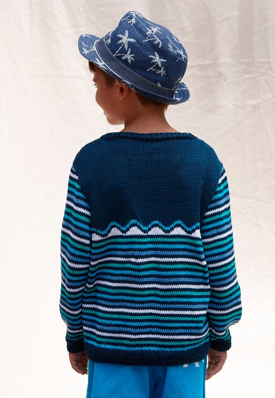 LANG YARNS "Golf" (100% Baumwolle, LL ca 125 m/50 g): ca 200 (200-250-250) g Dunkelblau Fb 0034, je ca 50 g Türkis Fb 0079, Smaragd Fb 0073, Weiß Fb 0001 und Ciel Fb 121; addi-Stricknd 3,5 mm, addi-Nadelspiel 3,5 mm.