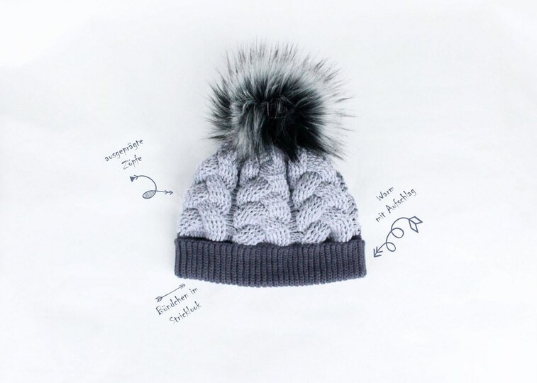 Es wird erklärt: Material, Erklärung für alle Größen, Rand, Mitte (Zopfmuster), Spitze der Mütze, Bommel, 22 Seiten, über 50 Fotos, Beschreibung.