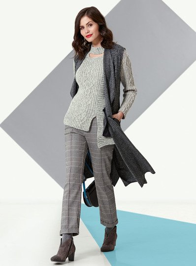 LANG YARNS "Novena" (50% Wolle, 30% Alpaka, 20% Polyamid, LL ca 110 m/25 g): ca 425 (475-525) g Hellgrau meliert Fb 0103; Prym-Stricknd 4,5 mm, Prym-Rundstricknd 4 mm und 4,5 mm, je 40 cm lang.