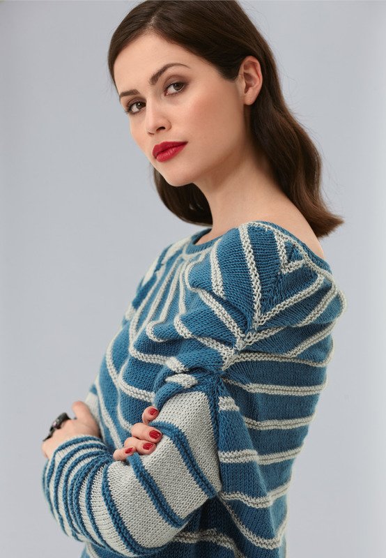 ONline "Chester Linie 350" (55% Wolle 33% Polyacryl, 12% Kaschmir, LL ca 118 m/50 g): ca 400 (450-550-600) g Jeansblau Fb 03, 250 (300-350-400) g Hellgrau Fb 08, KnitPro-Stricknd 4 mm, KnitPro-Rundstricknd 4 mm, 60 cm lang.
