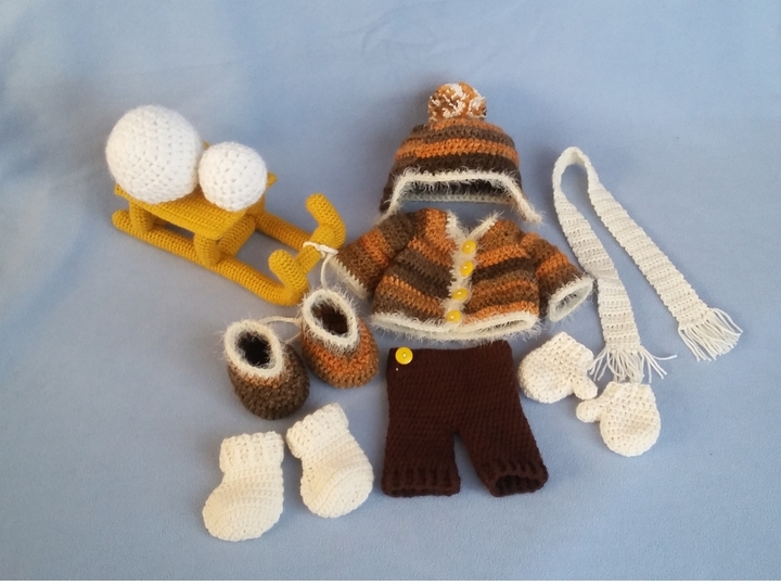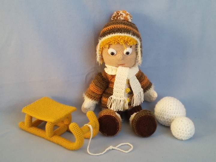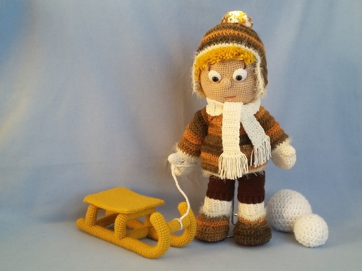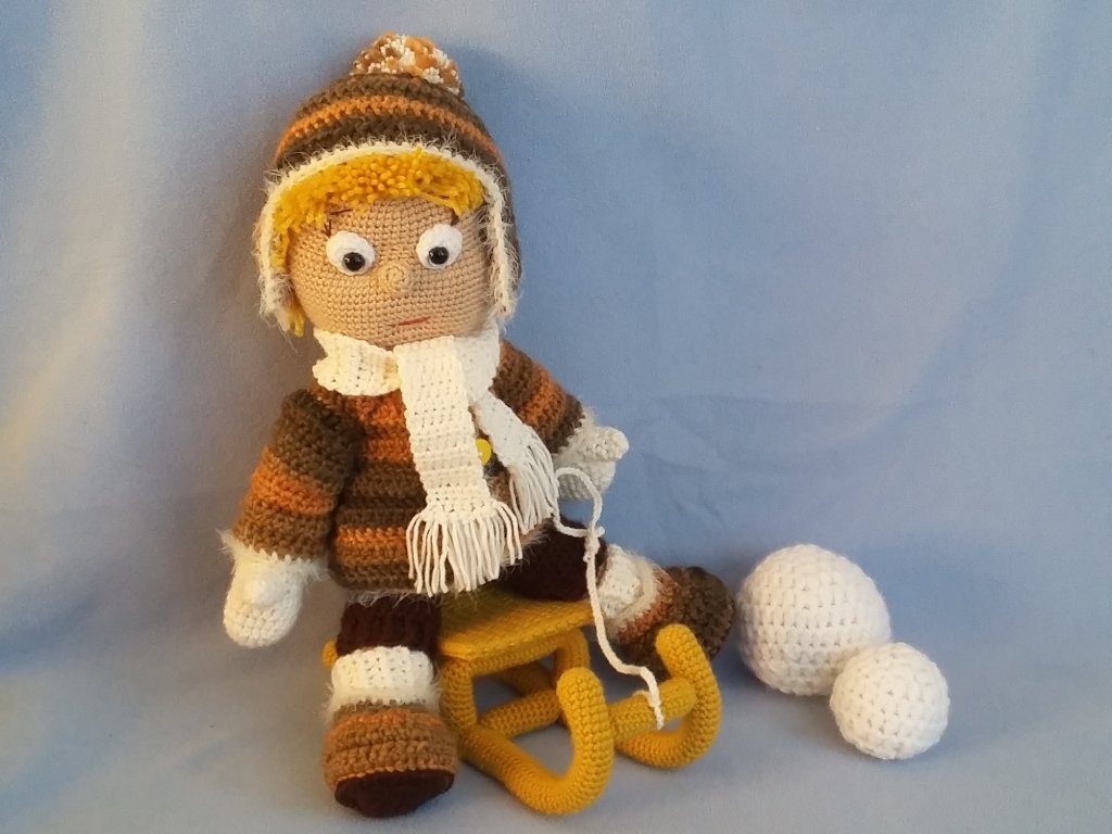 Die Kleidung passt Puppen von einer Größe von ca. 36 cm. Die PDF beinhaltet die Anleitung für die Jacke, die Hose, die Strümpfe, die Schuhe, die Mütze, die Handschuh, den Schal, sowie für den Schlitten und die Schneekugeln.