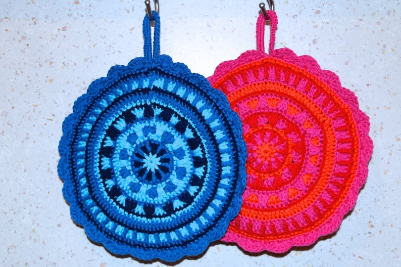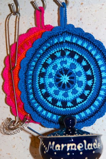 Mandala, das klingt fröhlich, bunt, verspielt. Und so sollen sie sein, die Mandala Topflappen. Ihr könnt sie kunterbunt aus vielen Resten häkeln oder etwas dezenter, mit mindestens drei Farben. Lasst eure Fantasie spielen und freut euch über wunderschöne Geschenke.